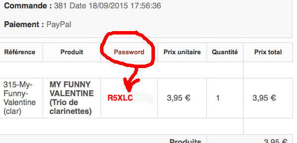 The code » PASSWORD » (written in red) to open each product, is located next to it, see this exemple: